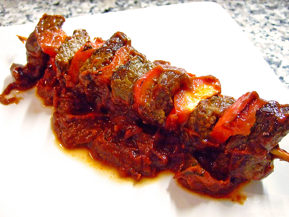 Tomatensoße mit Cayennepfeffer und Worcestersauce abschmecken und in eine große Kasserolle geben. Spieße in die Soße legen. Im vorgeheizten Backofen bei 200°C / Umluft 175°C / Gas Stufe 3 etwa eine Stunde garen.